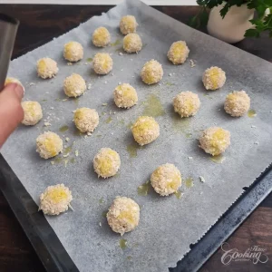 Arrange the coated balls on the prepared baking tray, leaving a little space between them. Lightly spray or brush them with oil to help them crisp up in the oven.